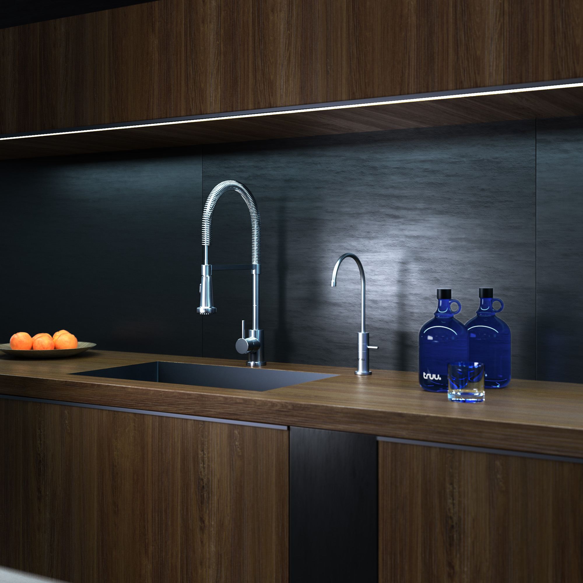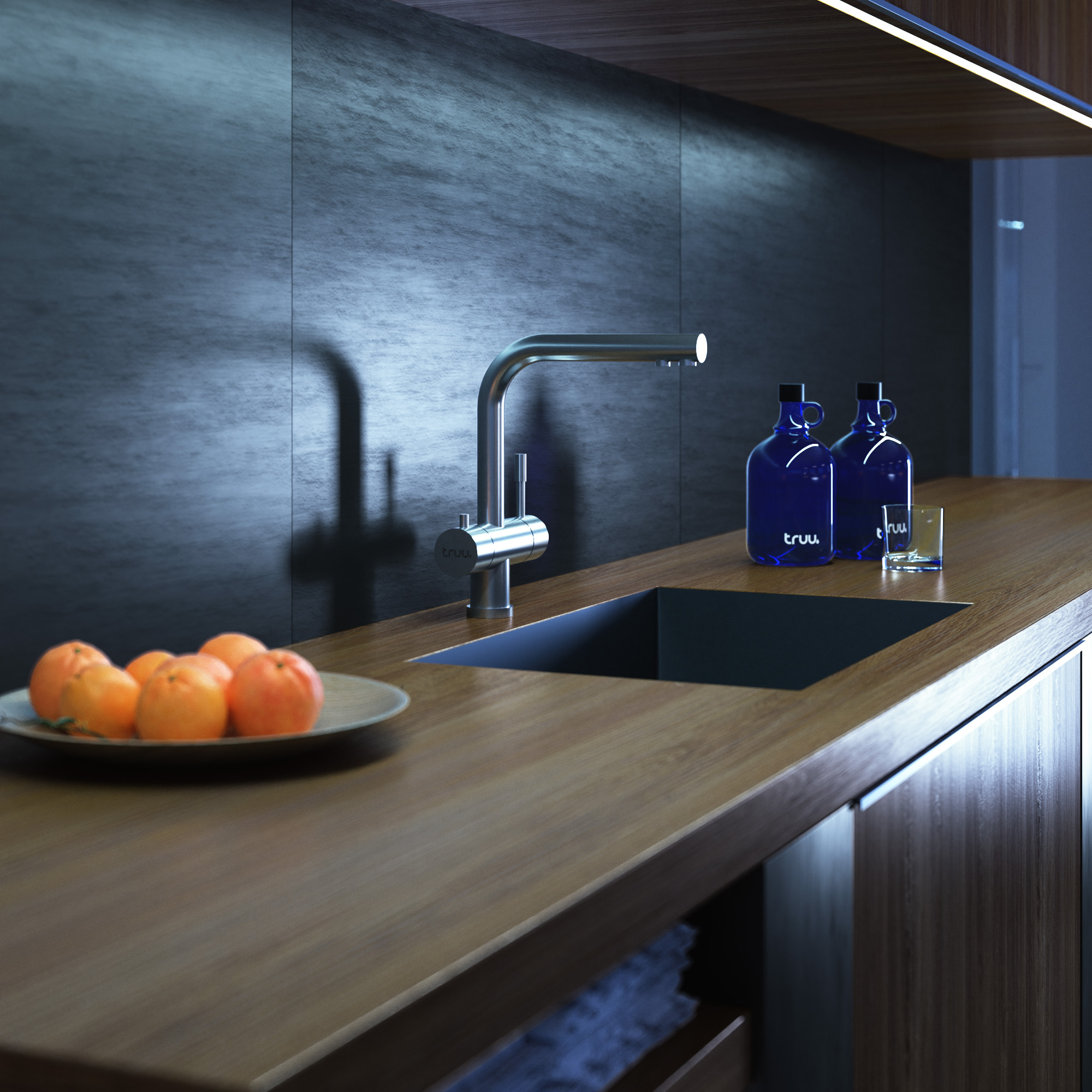 Der komplett aus Edelstahl gefertigte, schwenkbare Einwege-Hahn ergänzt deine bestehende Armatur und liefert reinstes truu original water.